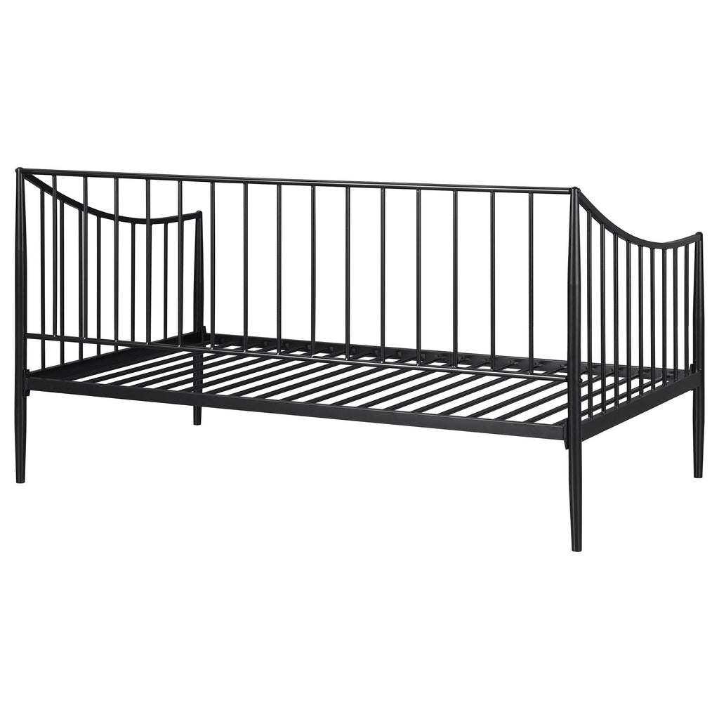 This stylish daybed offers a sleek and practical solution for guestrooms, living rooms, or compact spaces. Constructed from welded metal, it ensures lasting durability and stability. The powder-coated matte black finish enhances its modern, minimalist aesthetic while protecting against wear. Featuring a slatted metal platform, it provides reliable support for a twin mattress without the need for a box spring. Its streamlined design blends seamlessly into various settings, combining functionality with contemporary style.