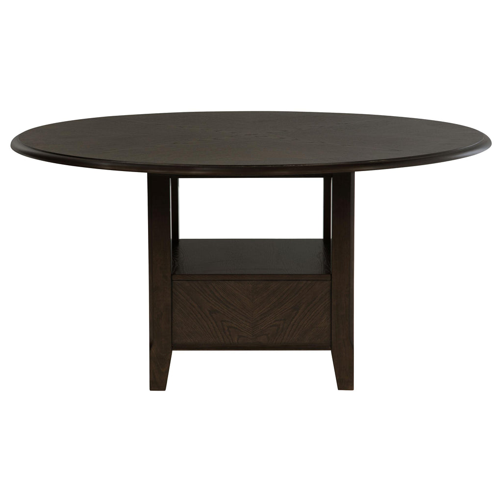 Create a stylish and functional dining area with this transitional round dining table. Featuring a spacious 60-inch tabletop in a rich, dark cocoa finish, this table makes a striking centerpiece for any dining room. The pedestal base includes two drawers for storing essentials and an open bottom shelf, perfect for displaying decor or keeping items within reach. With enough room to comfortably seat six, this elegant piece is ideal for both everyday meals and more formal gatherings, making it versatile enough for any occasion.