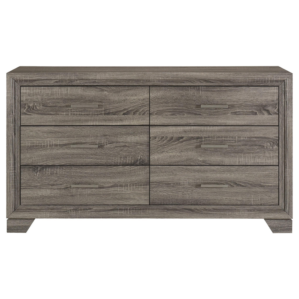 Create your ideal bedroom ambiance with the fresh, casual style of this transitional bedroom set. It features engineered wood construction with durable laminate surfaces, creating a stylish look with its brown oak wood grain finish. The set is clean lined, delivering a tall, squared headboard with foam padding and tan upholstery, creating the perfect place for lounging and reclining. The bed is complete with a low footboard and rails, offering a complete look that remains open and airy, great in small and large bedrooms alike. Storage pieces add ample drawer space and roomy tops, perfect for creating organization and offering a place for a personal touch of decor.